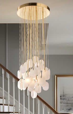 Gravity is an eight-light natural brass chandelier with alabaster pendants, also available in a 64-light version (cod. A5-GY-BR-ALS).