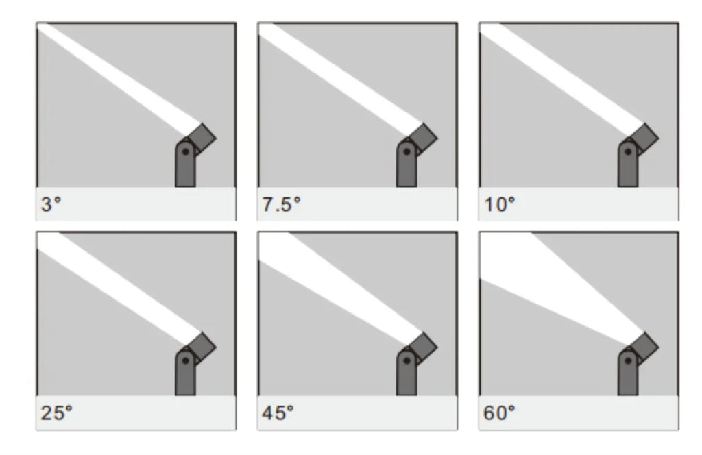 - Beam angles: 3°, 17.5°, 60°, 110°, 125°, 145°
